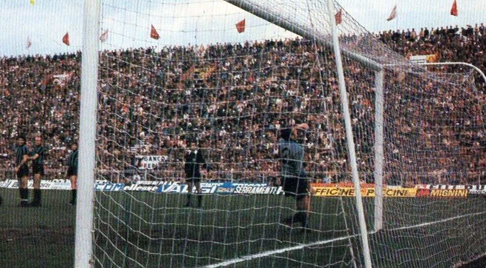«Nell’immagine la seconda marcatura su punizione ad opera del perugino Salvatore Bagni che batte l’atalantino Pierluigi Pizzaballa»),